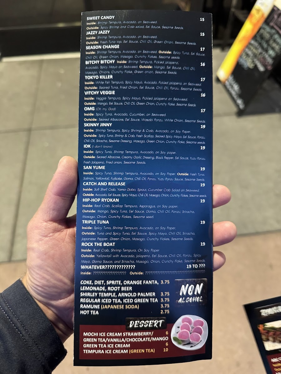 lnside: shrimp tempura. pickled jalapeno, avocado, spicy mayo on seaweed | Outside: mango, eel sauce, chili oil, masago, onions, crunchy flake.